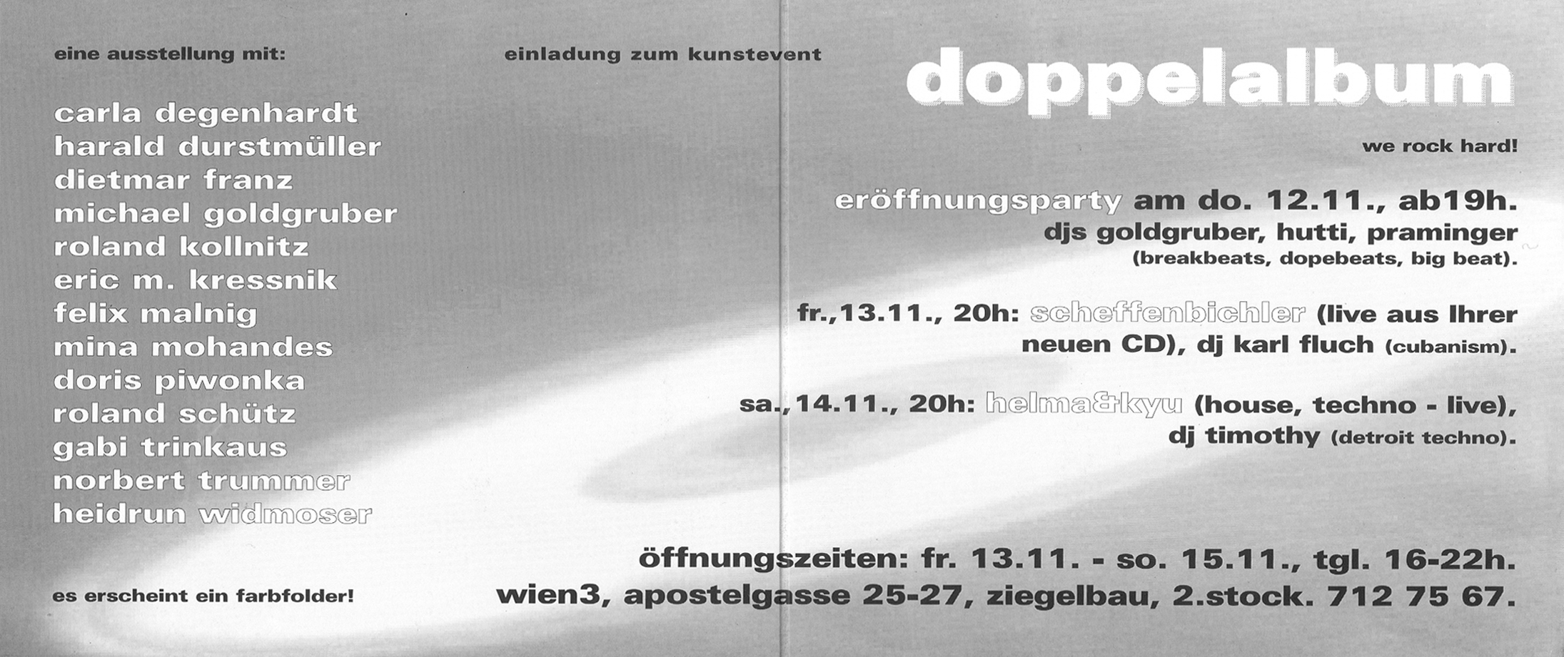 - "Après Ski x2" with Haldis Scheicher and Roland Ferrigato, Galerie V&V and T/abor, Vienna, Austria