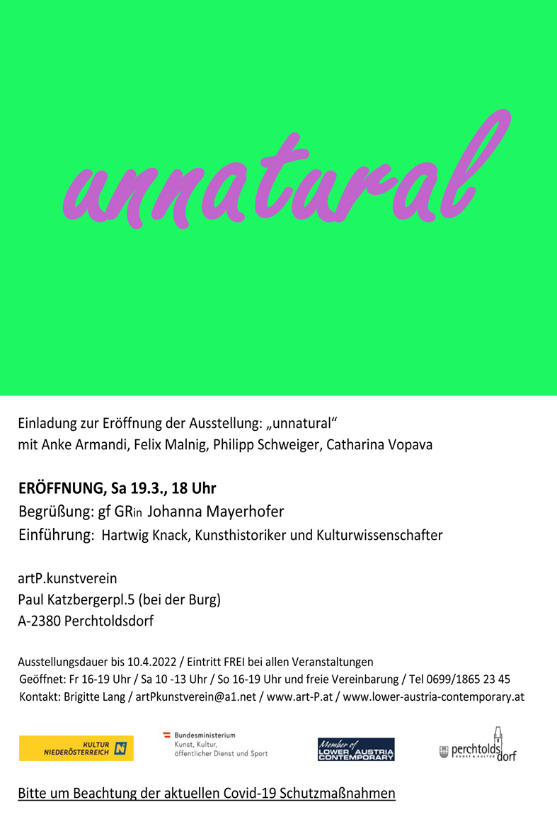 - "unnatural" with Anke Armandi, Philipp Schweiger and Catharina Vopava, artP.kunstverein, Perchtoldsdorf, Austria